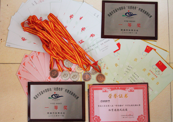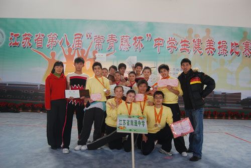 在张家港常青藤中学举办的第八届江苏省中学生健美操比赛中,我校选手一举拿下混双第二、第三名,三人操第二名,男单第三名,女单第六名以及大众规定和自选啦啦操两个二等奖并连续第四年获得体育道德风尚奖。在同一天举行的首届南通市健美操比赛中,刚集结一个多月的高一新队员们不畏强手、敢打敢拼,获得大众规定和自选啦啦操两个一等奖第一名。回想10月8日以来,青岛全国锦标赛、无锡全国联赛,江苏省比赛、南通市比赛的连续作战,心里百感交集。每次比赛都是一次战役,一次硬碰硬的对决,事实证明我们的队员都是好样的,是能够打硬仗的,“诚恒”这一南通中学的校训在他们身上得以真正体现。