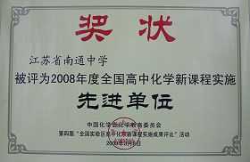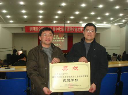 由中国化学会化学教育专业委员会等单位联合主办的第四届“全国实验区高中化学新课程实施成果交流大会”于2009年3月7日至8日在河南郑州外国语学校举行,我校被评为2008年度全国高中化学新课程实施先进单位。