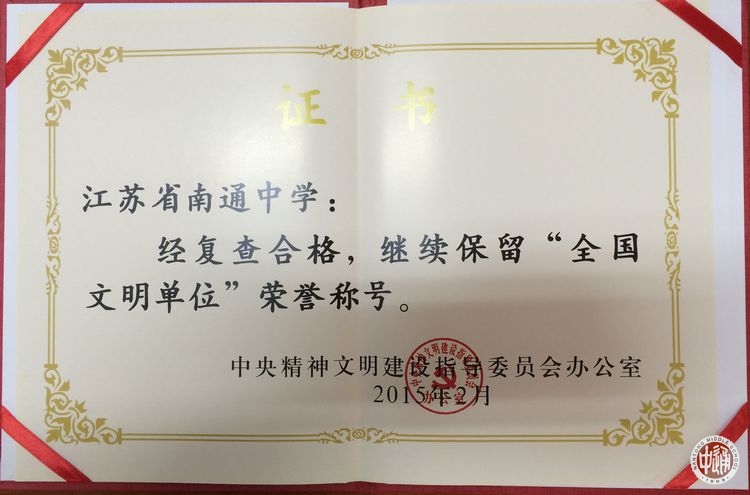 根据中央文明办下发的《关于全国文明城市提名城市(区)和继续保留的全国文明村镇、文明单位名单的通报》(文明办[2015]3号文件),在自查的基础上,经各省(区、市)文明委、中央国家机关有关部门文明委复查,中央文明办审核并报中央文明委批准,江苏省南通中学继续保留“全国文明单位”荣誉称号。