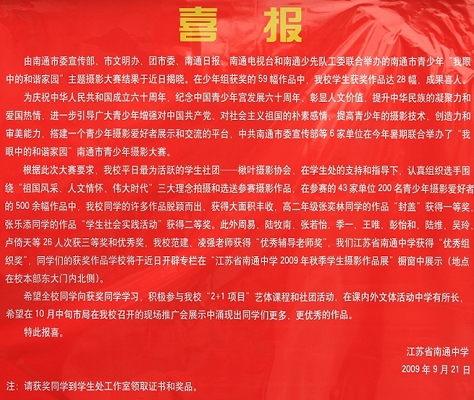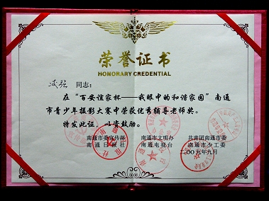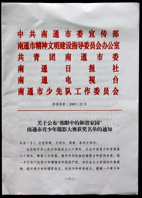 暑假期间,市委宣传部、市文明办、团市委、南通日报社、南通电视台和是少先队工作委员会联合举办南通市青少年“我眼中的和谐家园”主题摄影大赛。日前大赛揭晓,我校学生张奕林、张乐添两位同学分获一等奖和二等奖,另有26人次获三等奖和优秀奖。 此外,我校荣获大赛优秀组织奖,我校凌强和范建两位老师荣获优秀辅导老师奖。 |