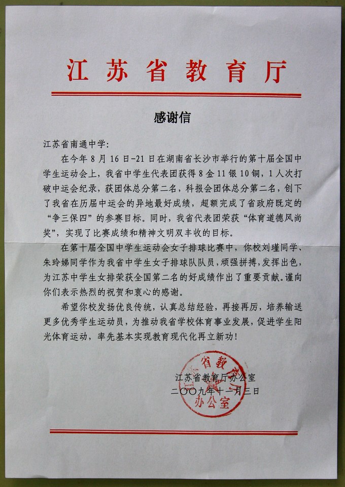 我校高三11班刘瑾同学(下图右)和高二7班朱玲娣同学(左)作为江苏省中学生女子排球队员参加第十届全国中学生运动会,顽强拼搏,发挥出色,为江苏省中学生女排荣获全国第二名的好成绩作出了重要贡献。为此,江苏省教育厅办公室特于11月3日给我校发来《感谢信》,向我校表示热烈祝贺和衷心感谢。