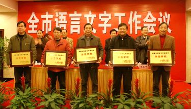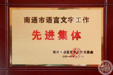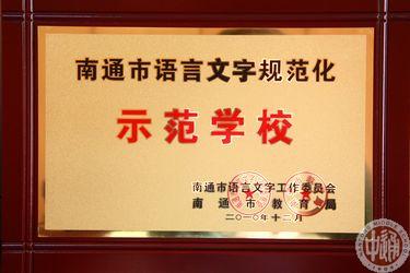 近年来,我校多次获得市语言文字工作先进集体称号。今年市语言文字工作委员会和市教育局多次召开语言文字规范化示范学校推进会,并组织专家对市直学校和五县四区50所申报学校进行了材料审查和实地检查。经评审,我校获得“南通市语言文字规范化示范学校”和“南通市语言文字工作先进集体”称号。左图是我校副校长许建平(右一)在12月15日全市语言文字工作会议上接收奖牌的镜头。 |