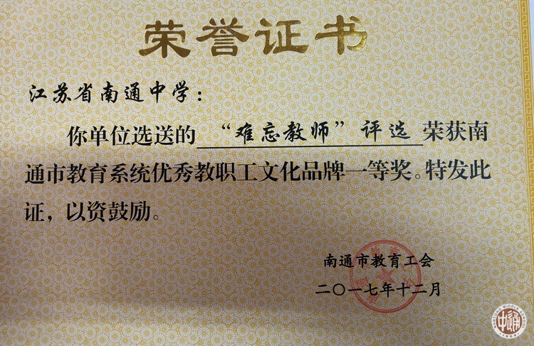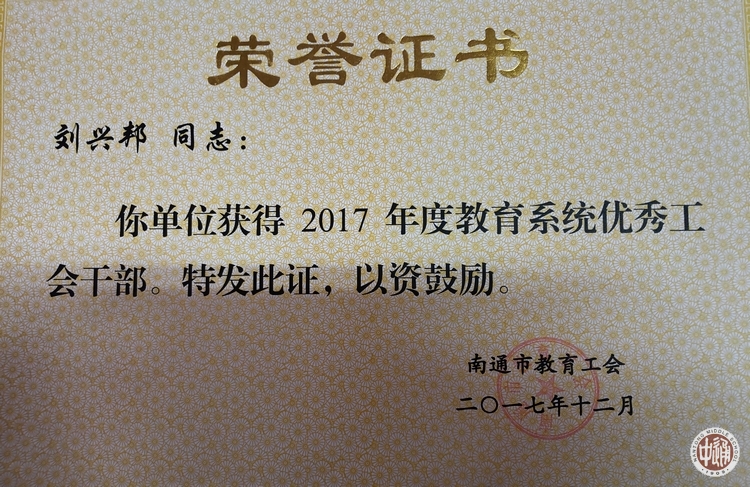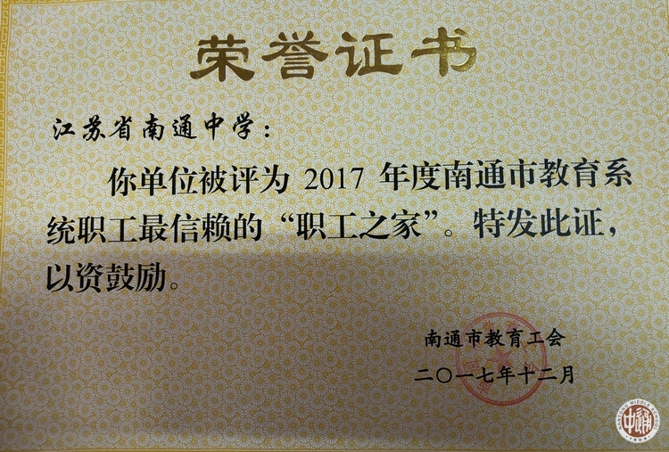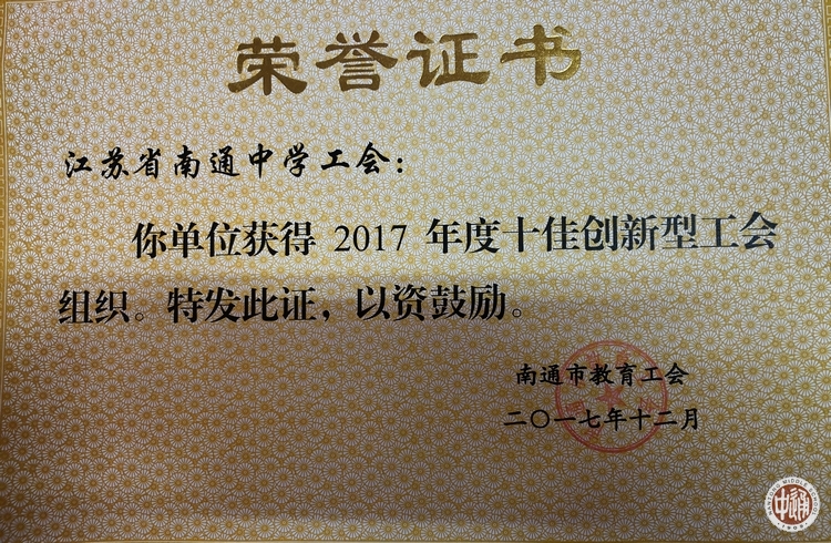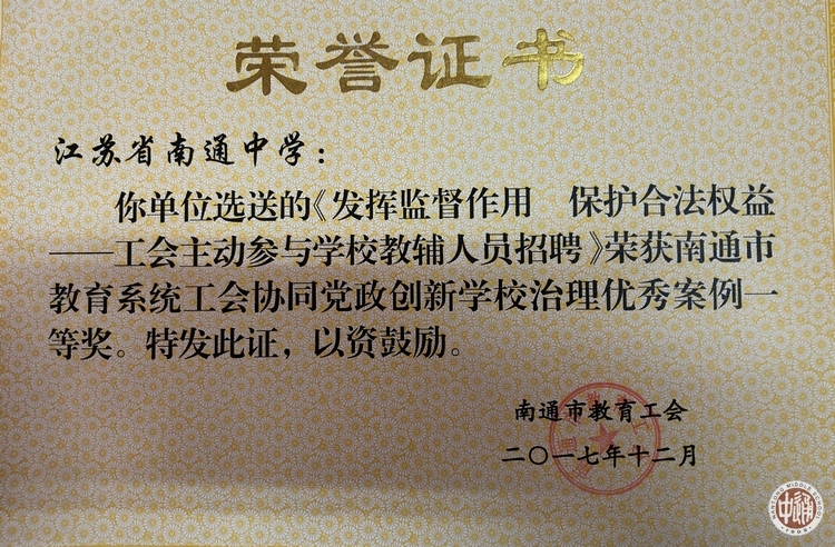 在市教育工会组织开展的2017年度多项评选中,我校再获多项殊荣。学校工会被评为南通市教育系统“创新型工会组织”、教职工最信赖的“职工之家”,案例《发挥监督作用 保护合法权益——工会主动参与学校教辅人员招聘》获得工会协同党政创新学校治理优秀案例评比一等奖,《“难忘教师”评选》获得优秀教职工文化品牌评比一等奖,体育学科被评为教育系统工人先锋号,刘兴邦副主席被评为“优秀工会干部”,许莹老师被评为教职工最信赖的“娘家人”,张义成老师和汪留屿老师被评为“青蓝工程”优秀师徒。