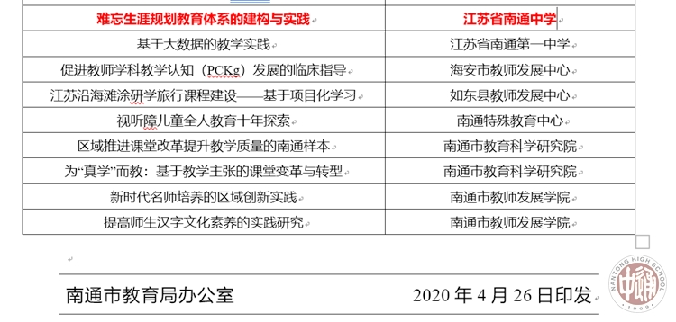 根据南通市教育局《关于公布基础教育教学成果选培项目评审结果的通知》(通教基〔2020〕13号),我校教学成果“难忘生涯规划教育体系的建构与实践”成功入选南通市基础教育教学成果培育项目。
