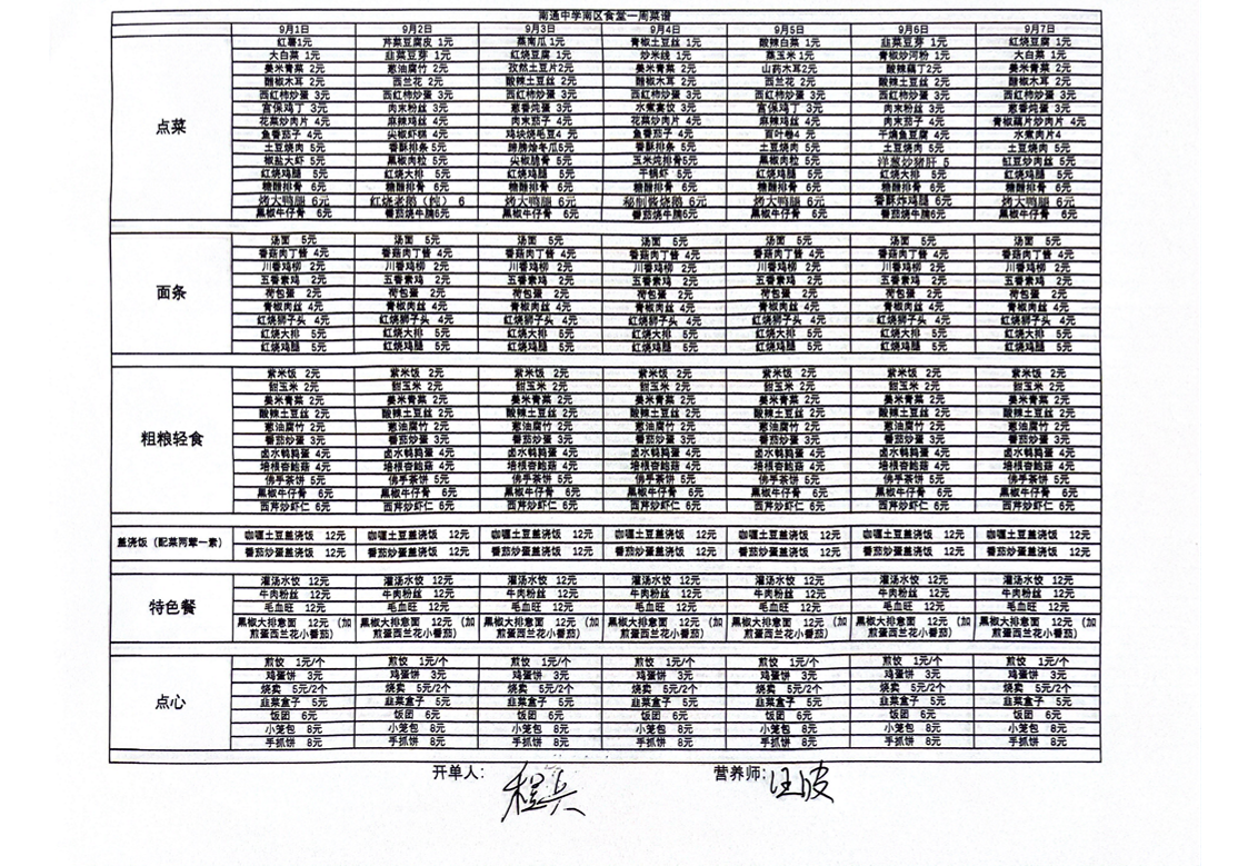 江苏省南通中学南区食堂一周菜谱(2024.9.1-9.7)