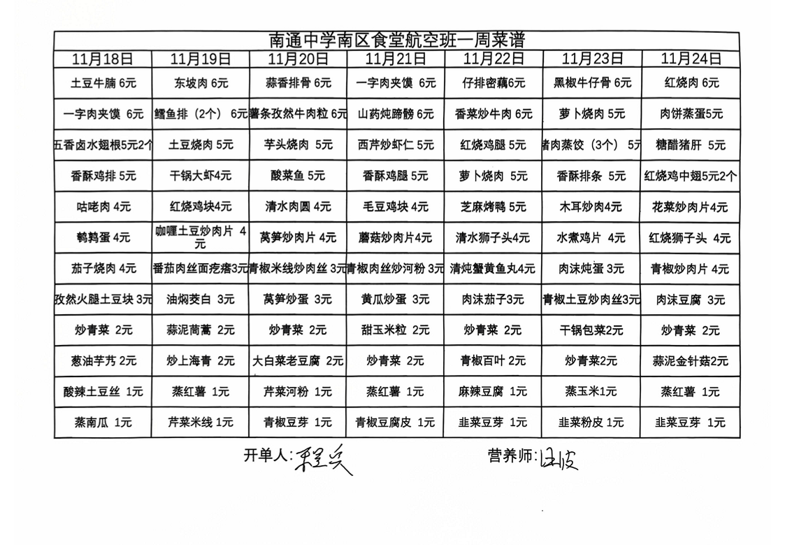 南区食堂航空班菜谱11月18日-11月24日