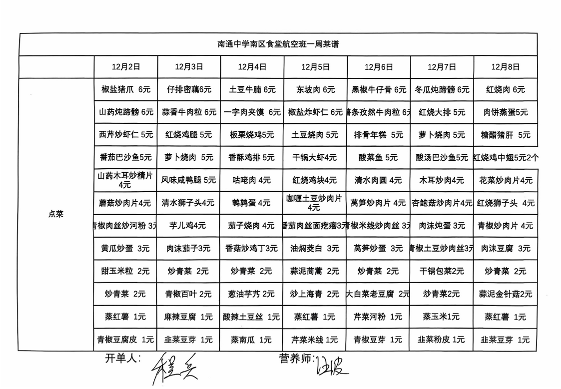 南区食堂航空班菜谱 12月2日-12月8日