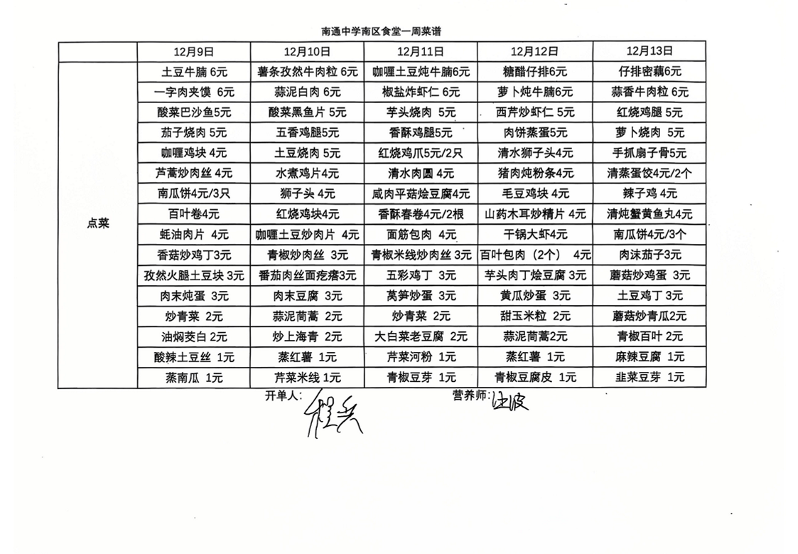 南区食堂菜谱 12月9日-12月13日