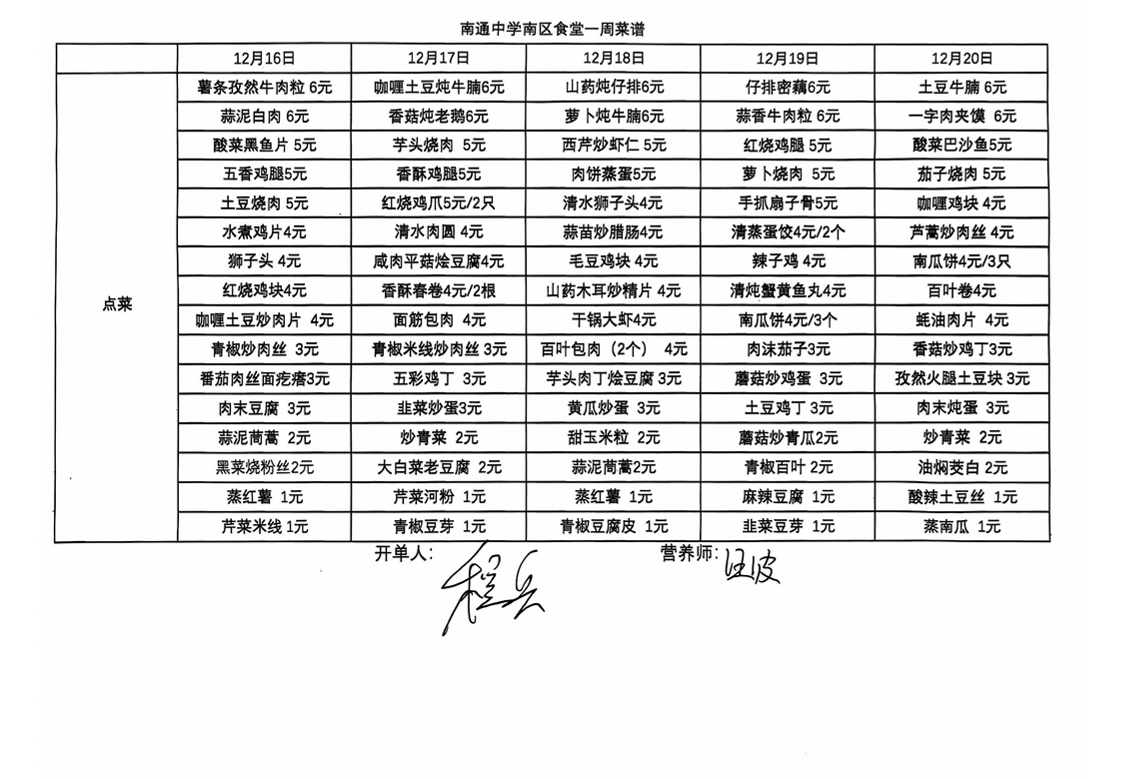 南区食堂菜谱12月16日-12月20日