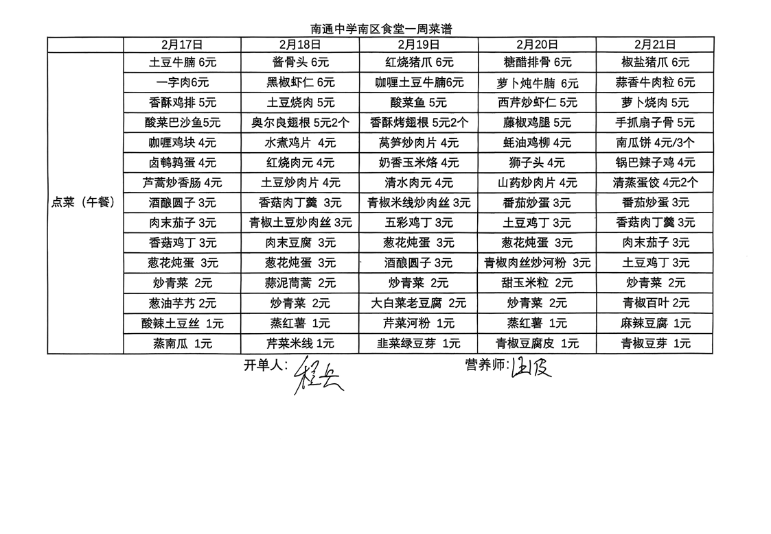 南区食堂菜谱2月17日-2月21日