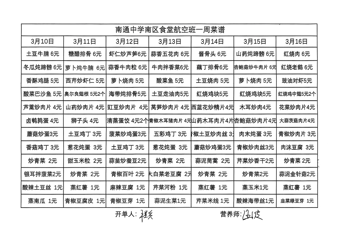 南区食堂航空班菜谱3月10日-3月16日