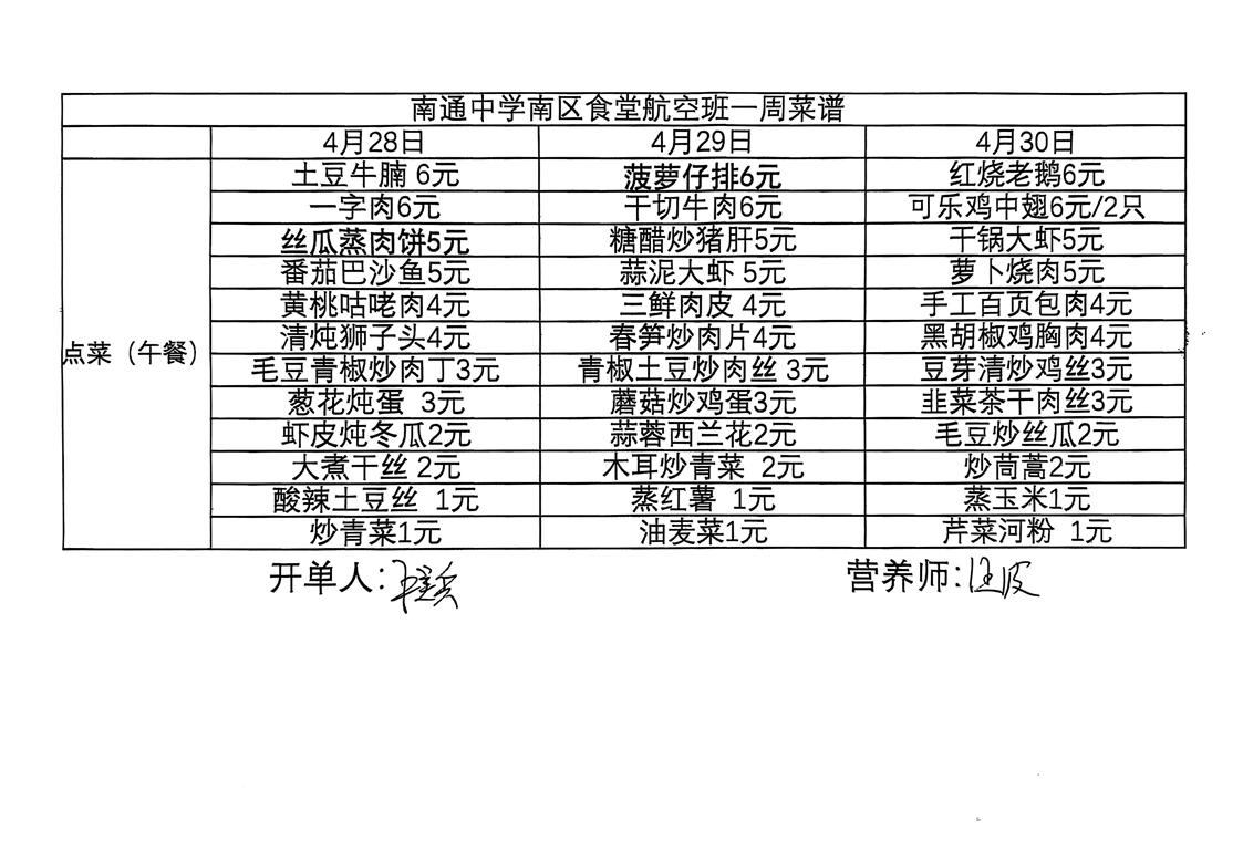 南区食堂航空班菜谱4月28日-4月30日