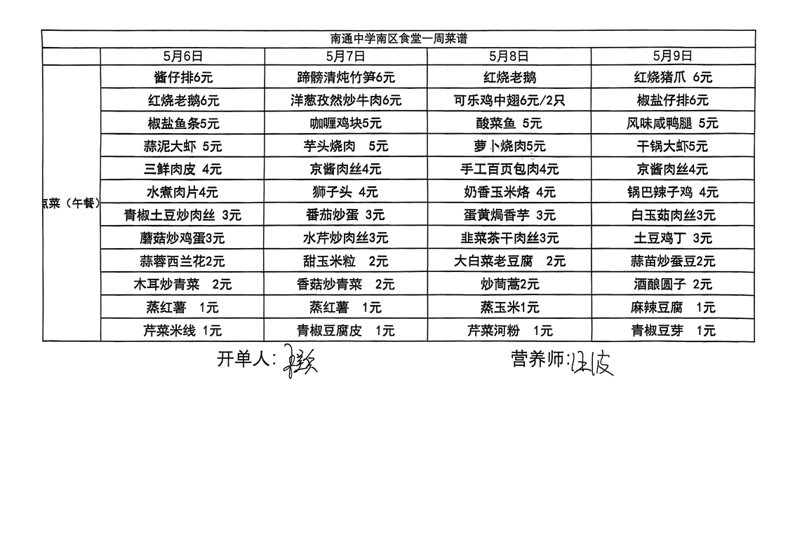 南区食堂菜谱5月6日-5月9日