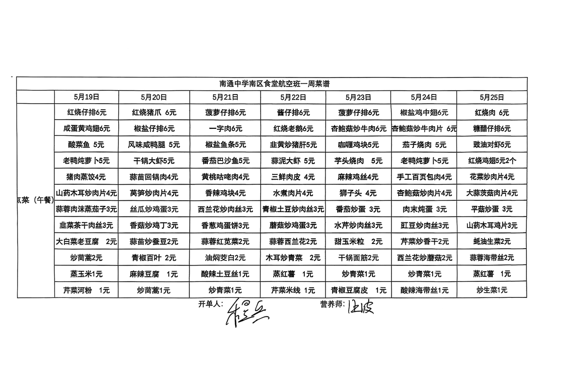 南区食堂航空班菜谱5月19日-5月25日