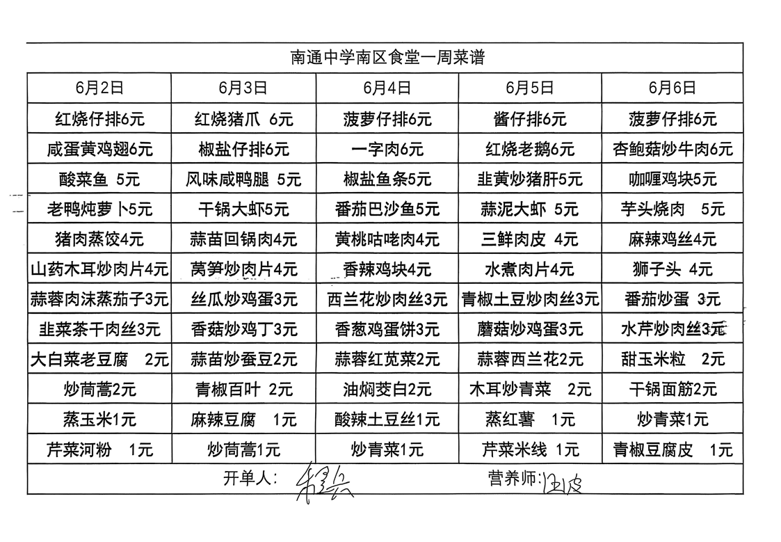 南区食堂菜谱6月2日-6月6日