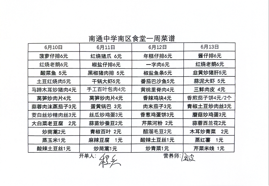 南区食堂菜谱6月10日-6月13日