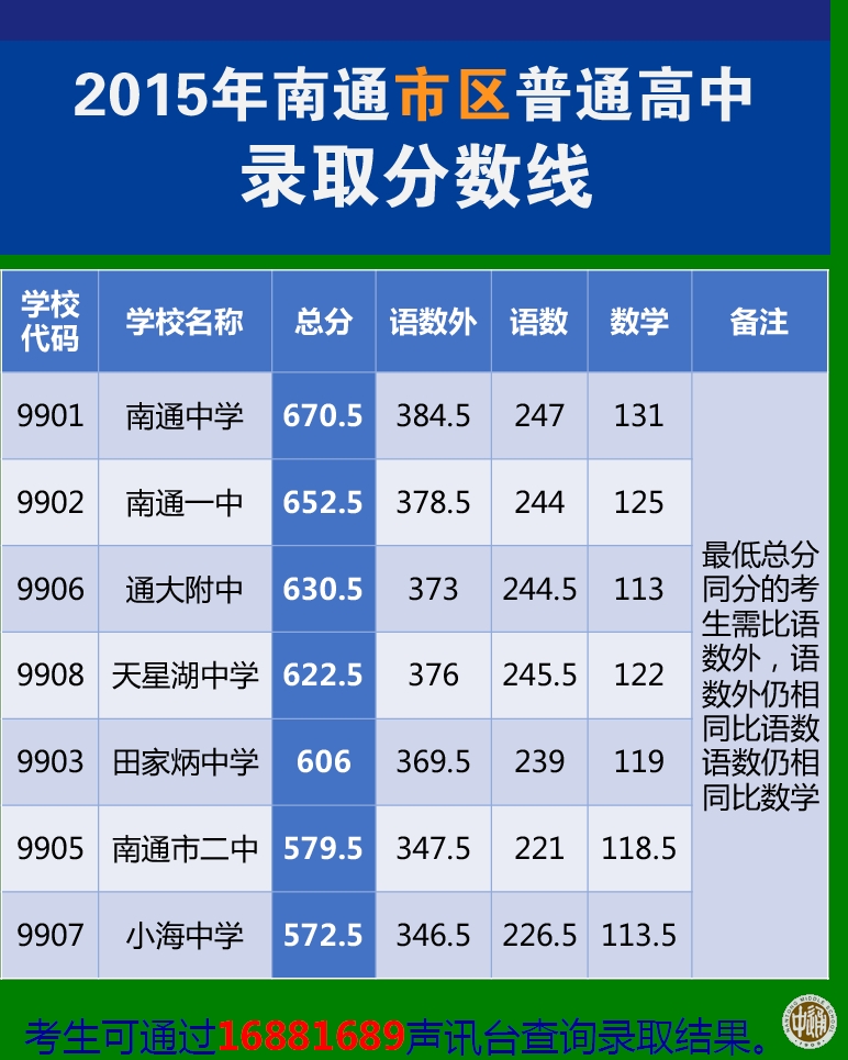 2015年南通市区普通高中录取分数线