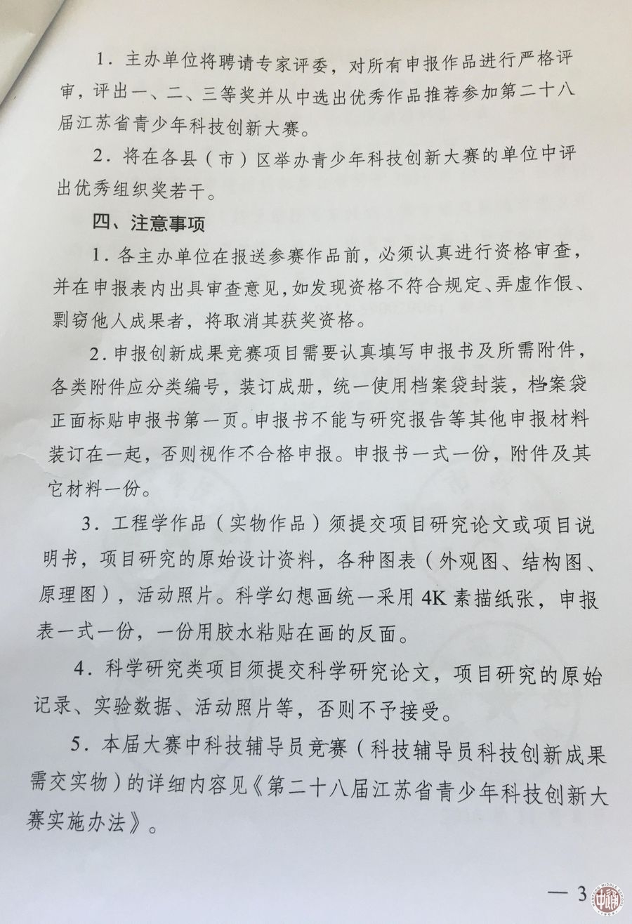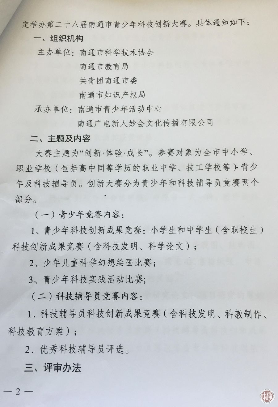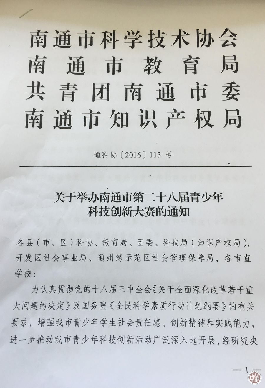 关于举办南通市第二十八届青少年科技创新大赛的通知 来源:教务处 发布时间:2016-12-05 15:11:29 浏览次数: 次 【字体:小 大】 南通市第二十八届青少年科技创新大赛开赛在即,请有参赛意愿的学生和黄金如老师联系,学校将统一报送,截止时间2016年12月14日,具体要求见文件 分享到: 【打印正文】