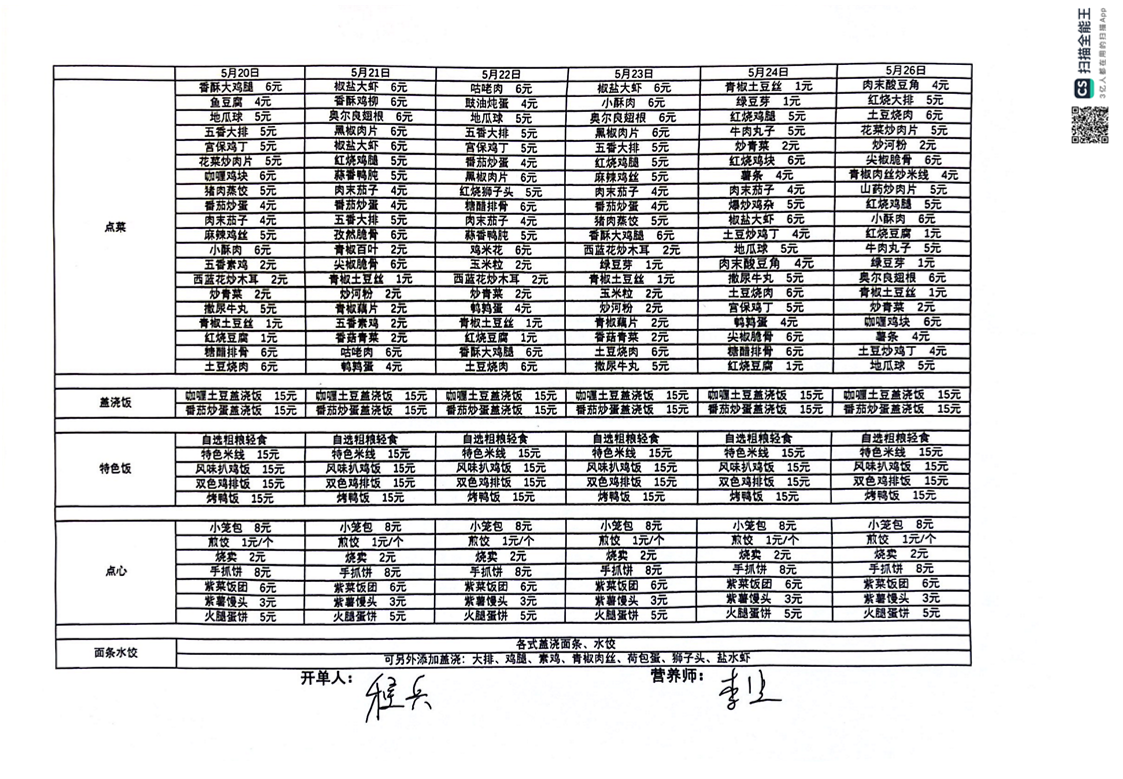 江苏省南通中学南区食堂一周菜谱(2024.5.20-5.26)