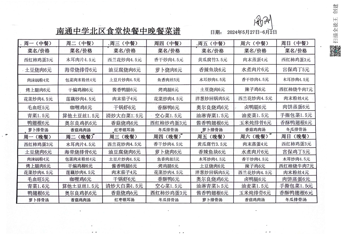 江苏省南通中学北区食堂快餐菜谱(2024.5.27-6.2)