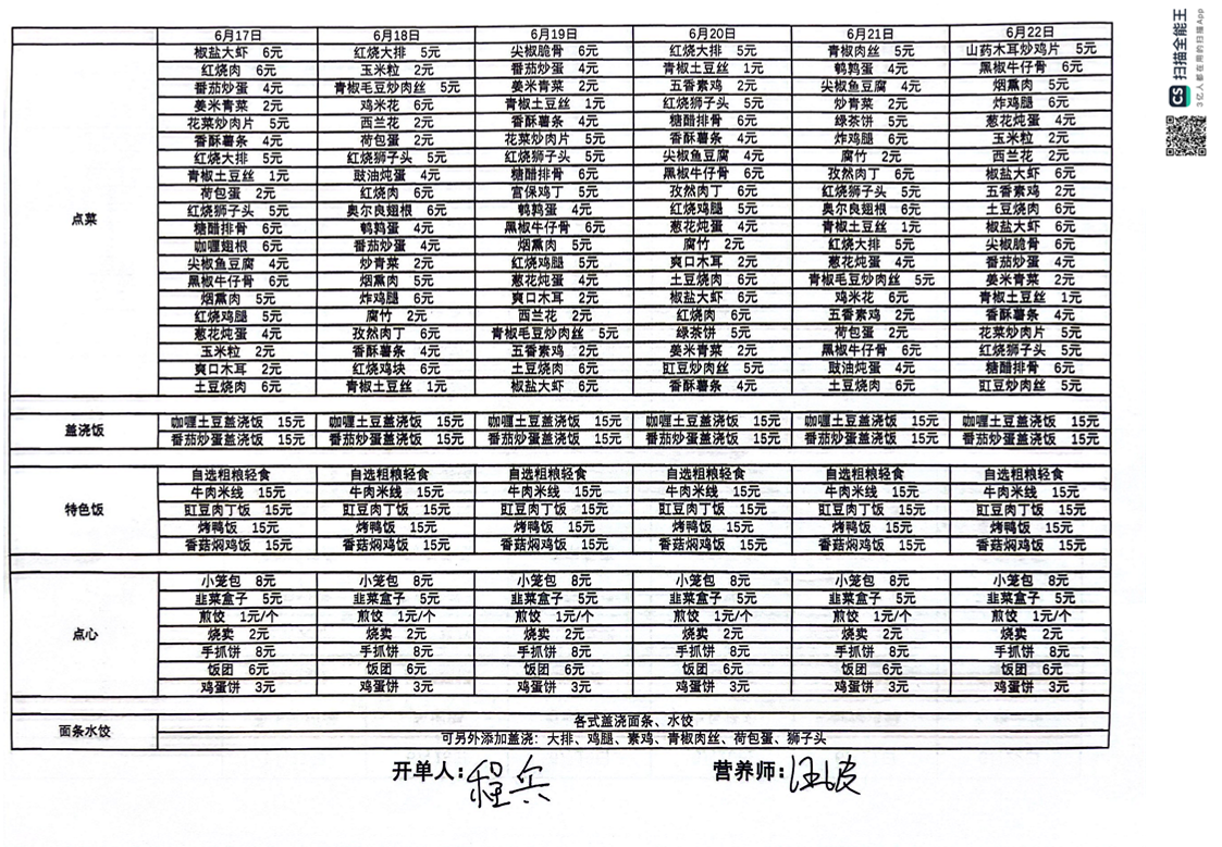 江苏省南通中学南区食堂菜谱(2024.6.17-6.23)