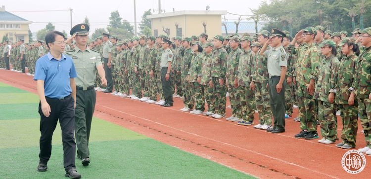 升国旗、奏国歌,迎队旗,在雄壮的进行曲中,党委书记朱全中在解放军理工大学教官的陪同下,检阅列队。