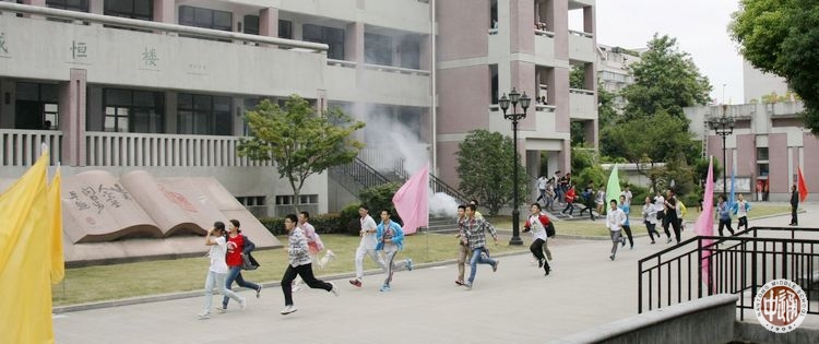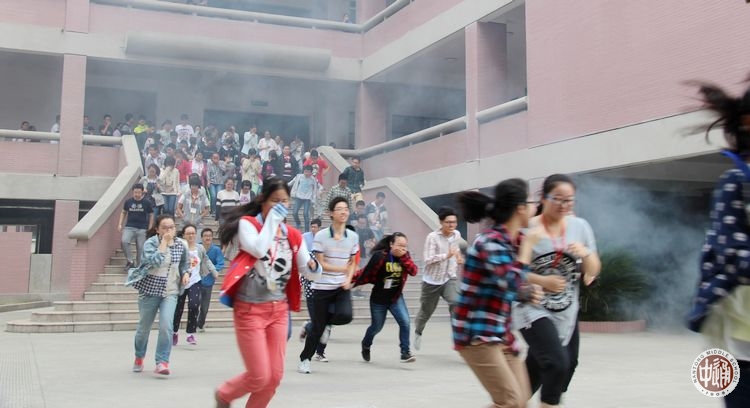 上午8:30,学校诚恒楼、求真楼、崇问楼三幢教学楼楼道内浓烟滚滚,消防警报响彻校园,南、北校区近3000名学生在班主任和学生处工作人员的组织引导下,按照预定的演练方案,从各自教室撤离,逃离“火灾现场”,到达安全地带,整个过程用时3分钟。撤离过程中,有的同学用湿毛巾或衣服捂住口鼻,有的扶着墙壁、沿着楼梯半蹲弯腰前进,整个过程井然有序、迅速到位,达到了预期的效果。演练过程中,市消防支队孩儿巷中队的官兵现场为师生们作了消防安全知识普及,泡沫灭火器使用的讲解、示范,多名学生还现场进行了灭火演练。