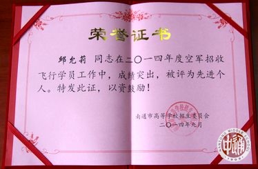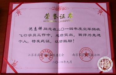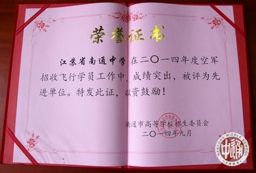 近日,江苏省高等学校招生委员会和南京军区空军政治部联合对“2014年度招收空军飞行学员先进单位”进行表彰,并颁发奖牌。我校被评为“2014年度空军招飞工作先进单位”。沈惠祥副校长和学生处邱允莉副主任分别获省、市招飞工作先进个人。
