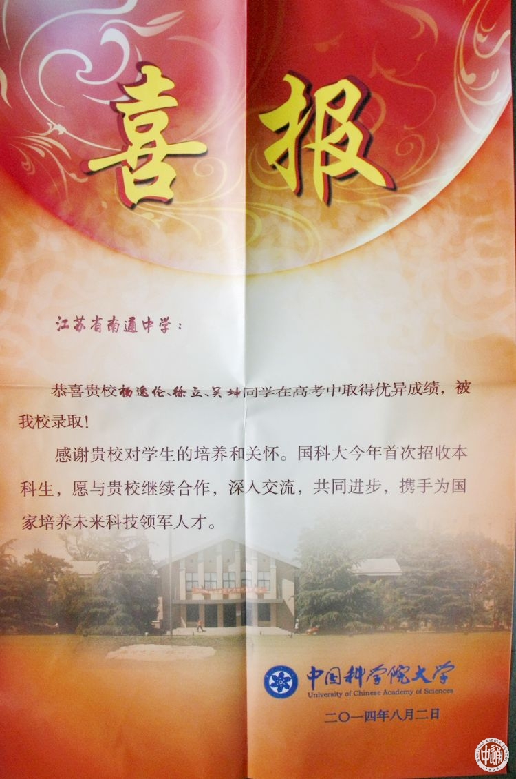 近日,中国科学院大学向我校发来喜报,热烈祝贺我校2014届高三杨逸伦、徐立、吴坤3位学子喜录该校;对我校培养和关怀学生表示感谢;希望与我校继续加强合作,深入交流,共同进步,携手为国家培养未来科技领先人物。