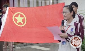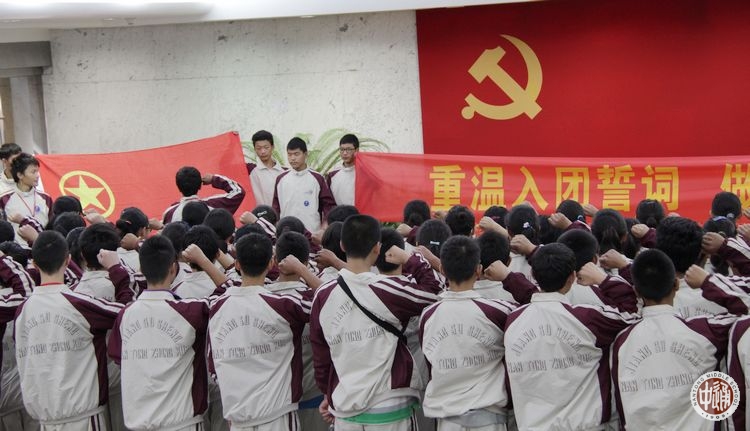 在“一大”会址鲜红的党旗前,同学们郑重地高举右拳,重温入团誓词,整齐嘹亮的声音回荡在庄严肃穆的大厅。