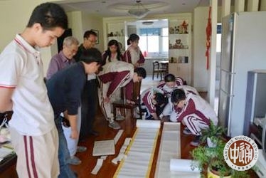 再看长卷上的字,个个隽秀,字形、间距也保持的很好,我们当中学过书法的一位同学也赞叹不已,我们更是自叹不如。看着看着,我们也有了疑问,写这么多就不会有错字吗?老人便跟我们分享了一个心得。将错字下的宣纸轻轻取出,再将一张写着正确字形的纸块贴上去,这就不大影响整体效果了。