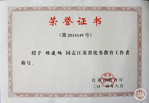 为表彰先进,进一步弘扬尊师重教的良好社会风尚,激励广大教师和教育工作者献身教育事业,吸引优秀人才长期从教、终身从教,建设高素质、高水平的教师队伍和教育管理干部队伍,推进教育事业改革与发展,今年8月,省教育厅授予全省383名同志“江苏省优秀教育工作者”荣誉称号。根据《关于表彰江苏省优秀教育工作者的决定》(苏教人【2014】24号),我校数学学科杨建楠老师荣获该项称号。