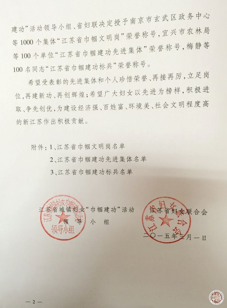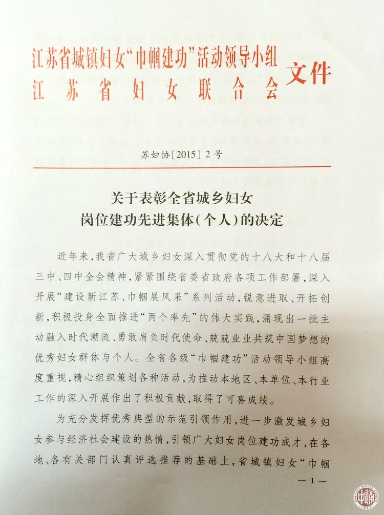 根据《关于表彰全省城乡妇女岗位建功先进集体(个人)的决定》(苏妇协【2015】2号)精神,全省城乡妇女岗位建功活动是我省妇女联合会为表彰先进、树立典型,充分发挥先进典型的示范引领作用,激发广大城乡妇女参与社会经济建设的热情而开展的表彰奖励活动,动员广大城乡妇女弘扬“四自”精神,锐意进取,不断创新,积极投身全面推进“两个率先”的伟大实践之中。此次活动中,全省共有100名同志被授予江苏省“巾帼建功标兵”荣誉称号。