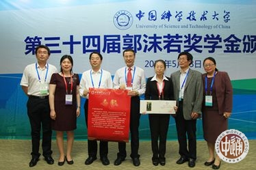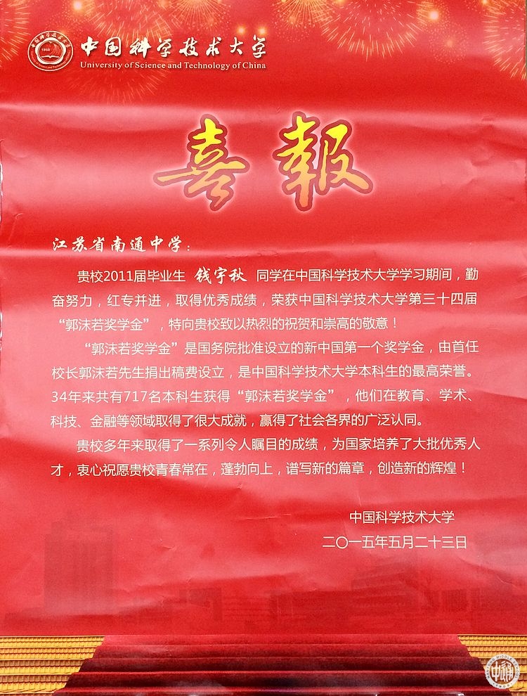 5月23日下午,第34届郭沫若奖学金颁奖仪式在中国科学技术大学举行,该校34名本科生荣获该奖,我校2011届优秀校友钱宇秋获此殊荣。当天,钱宇秋校友的父母、母校领导朱全中书记及班主任夏敏敏老师亲赴颁奖仪式现场,见证了钱宇秋同学从中国科学院院士、中国科学技术大学校长万立骏手上接过获奖证书。