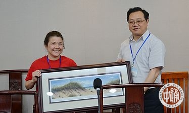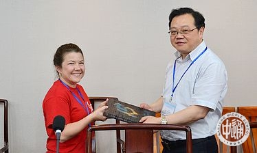在科学楼二楼会议室,沈惠祥副校长热情接待了来自太平洋彼岸的来宾,简要介绍了百年通中的办学历史、现状及特色。来宾们观看了百年通中专题宣传片,并互赠礼物。