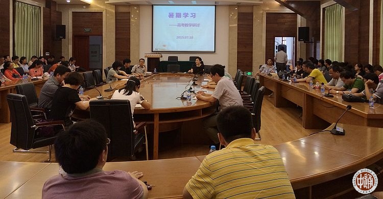 为进一步总结2015届高三教学工作的得失,尽早做好2016届高三的复习备考工作,7月10日下午,学校在国际交流中心召开了新、老高三全体任课教师参加的,以“严谨善教,携手共进”为主题的高三教学研讨会。陈建云副校长参加会议并讲话,教务处副主任徐德均主持会议。