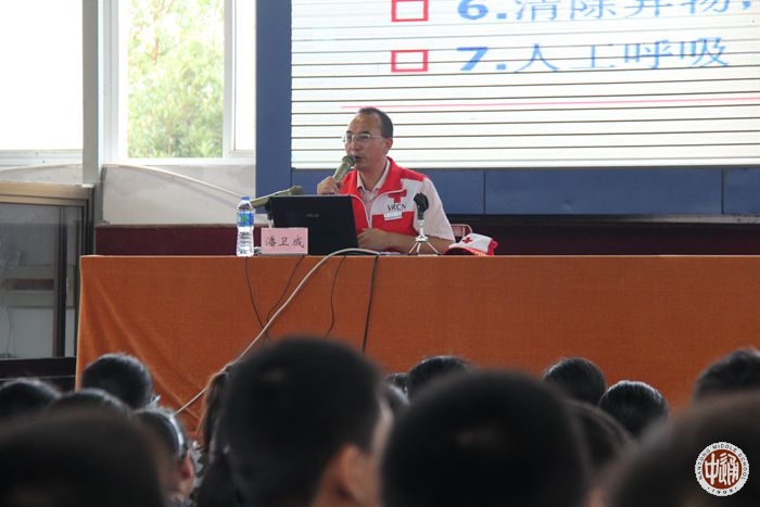 本次培训内容包括救护新概念、心肺复苏、体外自动除颤的使用、呼吸道异物阻塞的排除、创伤救护基本技能(止血、包扎、骨折固定及安全搬运)、常见急症现场处理、突发事件和意外情况现场应对等。主会场由南通市素质教育基地潘卫成主任进行集中理论知识讲授。然后分班级实际操作,同学们认真听讲、积极参与,颇有收获。