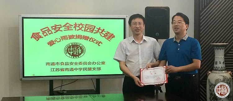 9月10日,南通食品药品监管局曹淞云副局长,南通食品安全委员会办公室邵倩副主任等亲临南通中学,为全校师生送来食品卫生安全知识宣传资料和500件爱心雨披。江苏省南通中学党委书记朱全中、副校长兼民盟通中支部主任陈建云、学生处主任滕旻彦等代表学校接受捐赠,双方均表示将为宣传食品安全知识、关爱师生健康、建设校园食品安全共同努力。