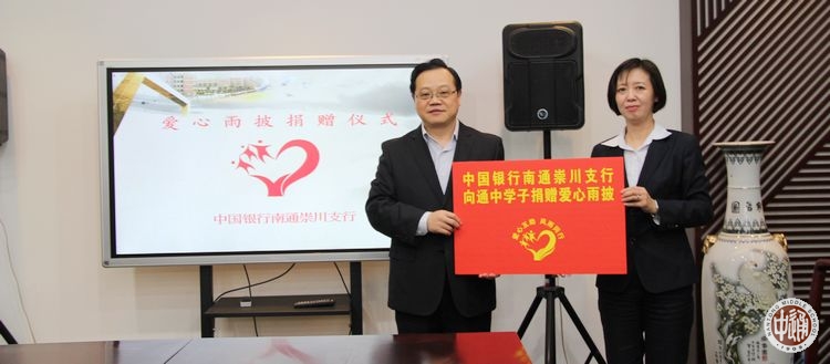 10月29日,中国银行崇川支行向我校赠送了400件自行车雨披和100件电动车雨披,以方便我校学生在雨天时使用。