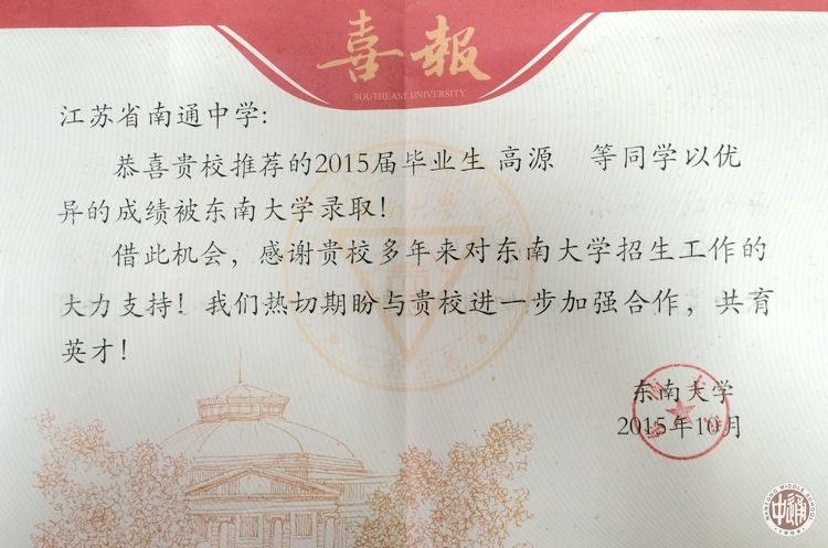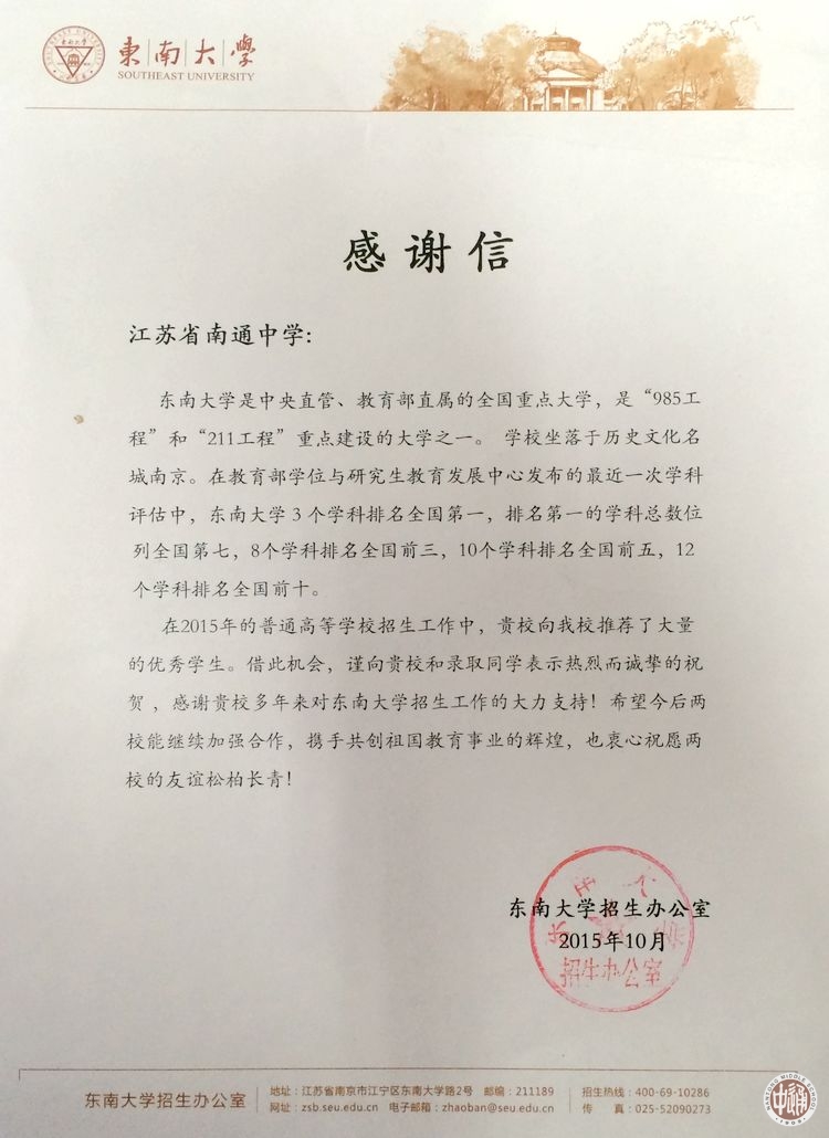 近日,东南大学、山东大学(威海)、南京农业大学、中国药科大学等高校向我校发来喜报和感谢信,对我校历届校友在高校求学期间取得的优异成绩表示祝贺,向我校长期输送优质生源表示感谢。