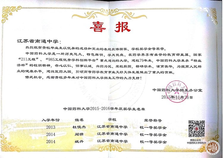 中国药科大学喜报