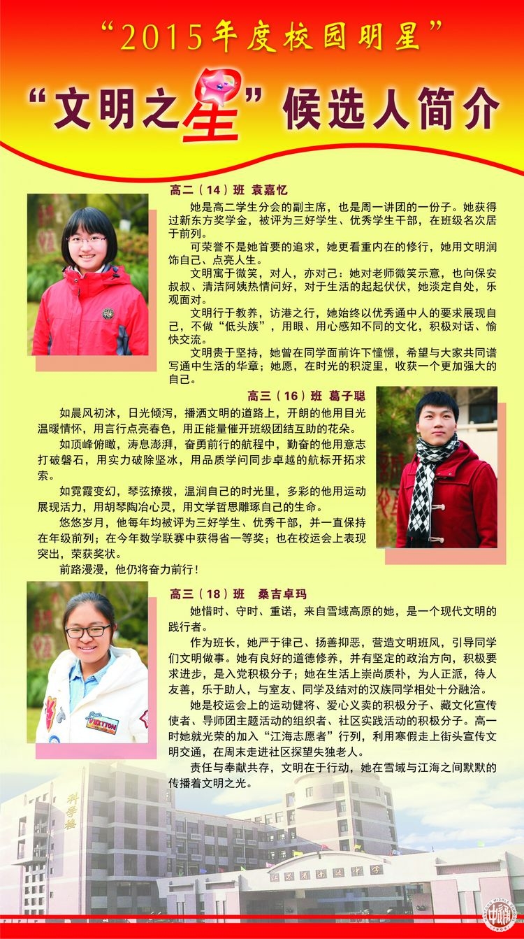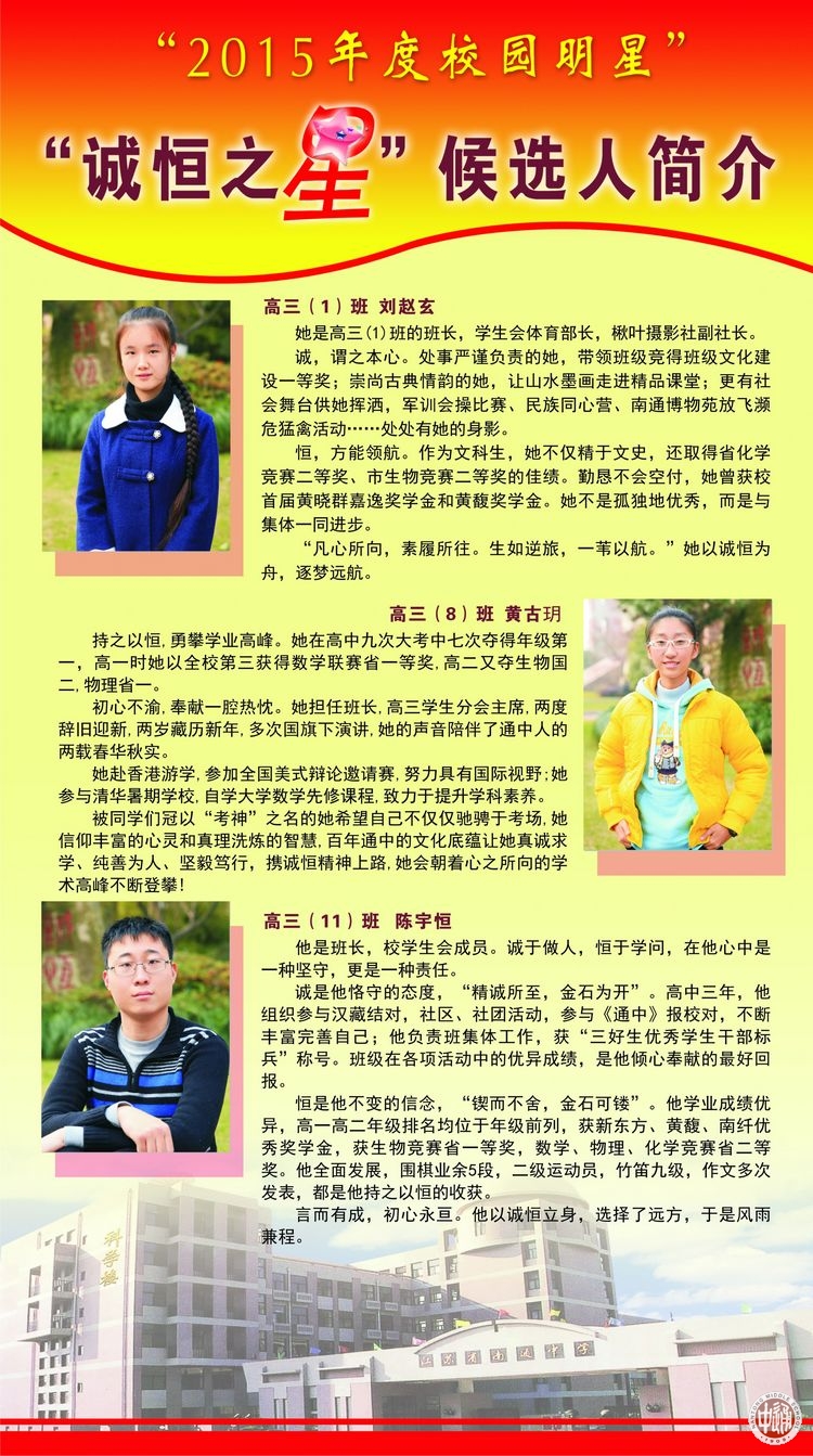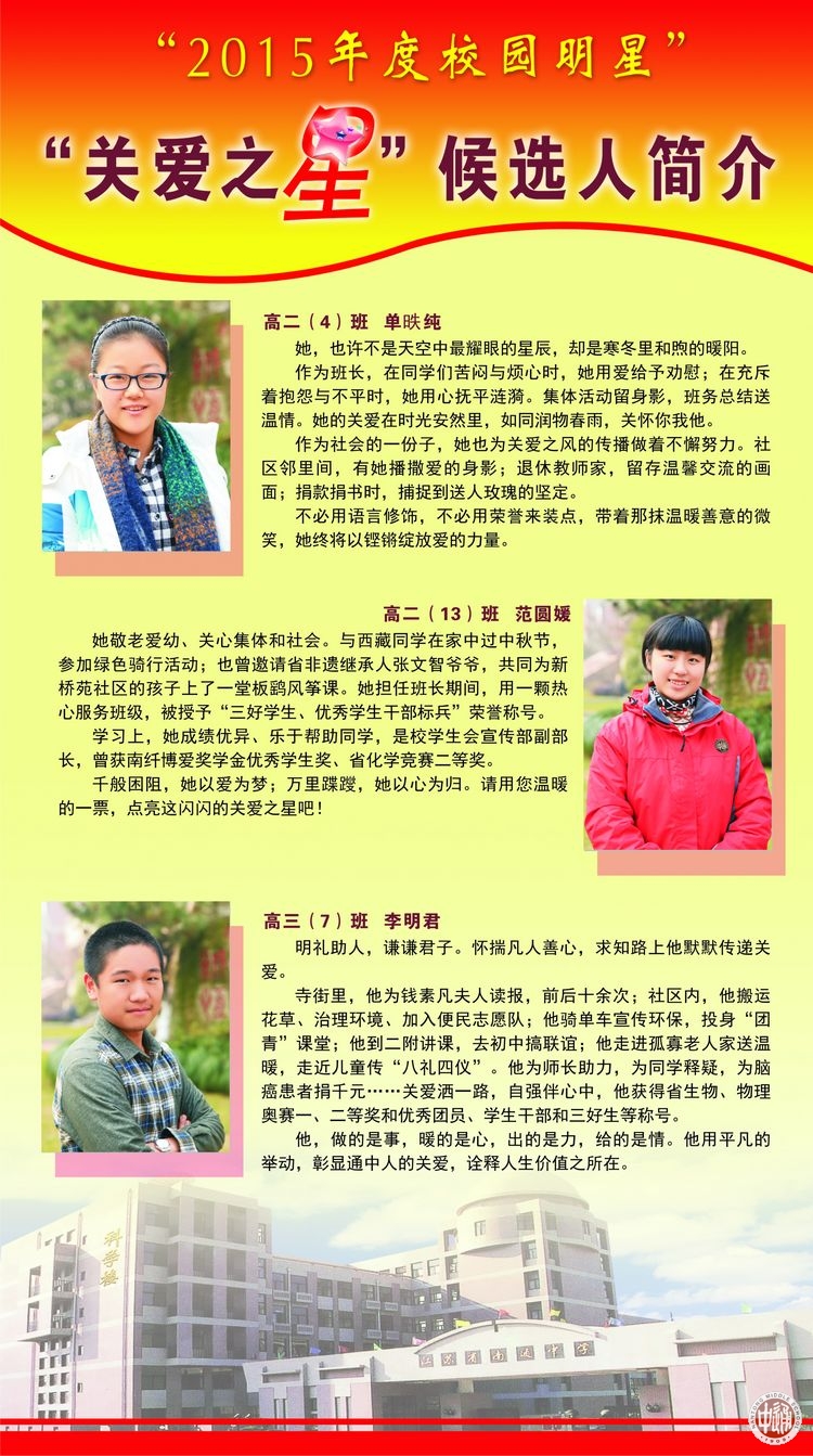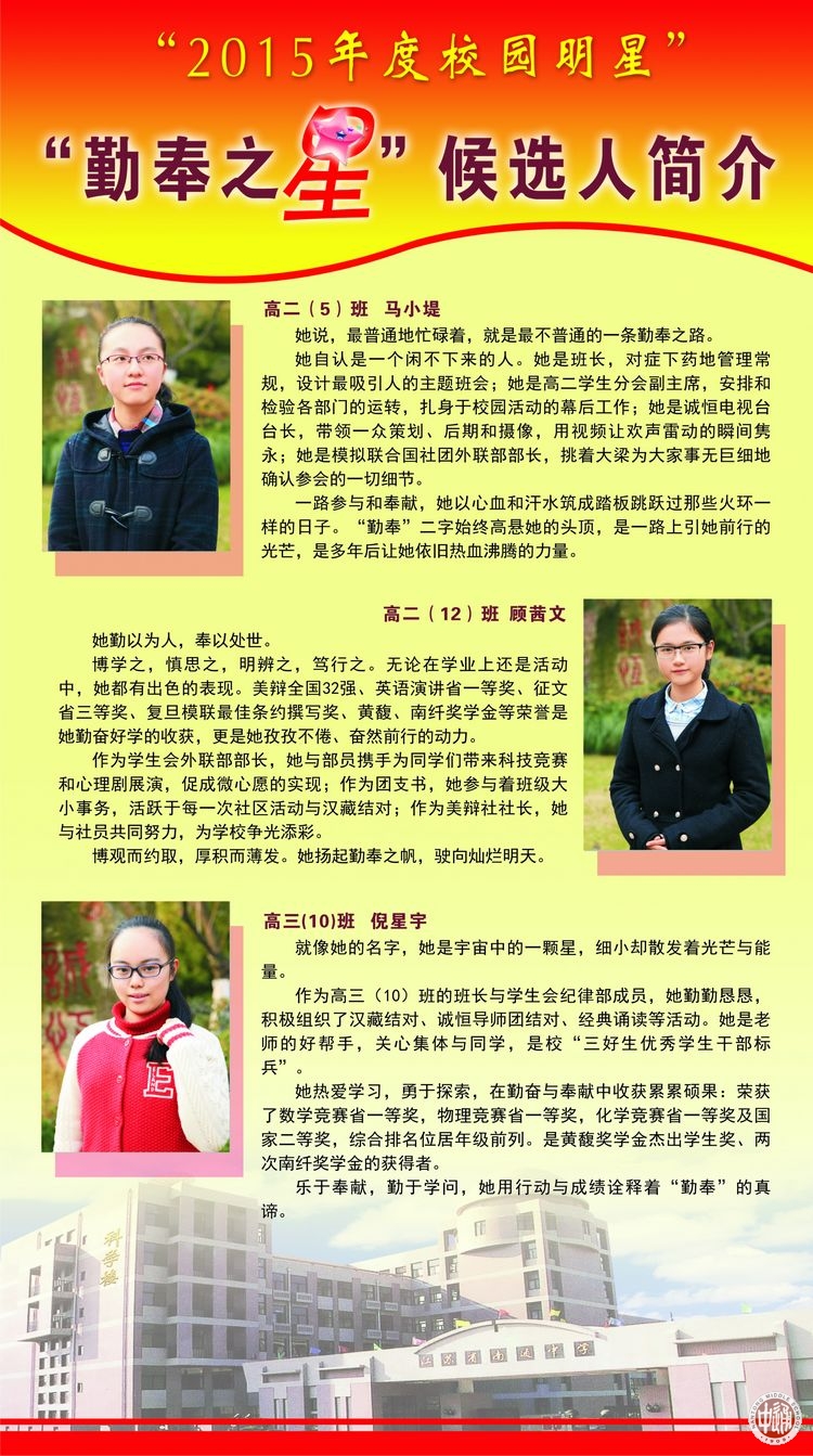 近日,我校2015年“校园明星”评选活动拉开帷幕。三十位校园明星候选人的精彩介绍深深打动着同学们,身边的明星成为大家不懈努力的感召力量。12月28日,全校学生将通过普选投票确定十位明星人选。