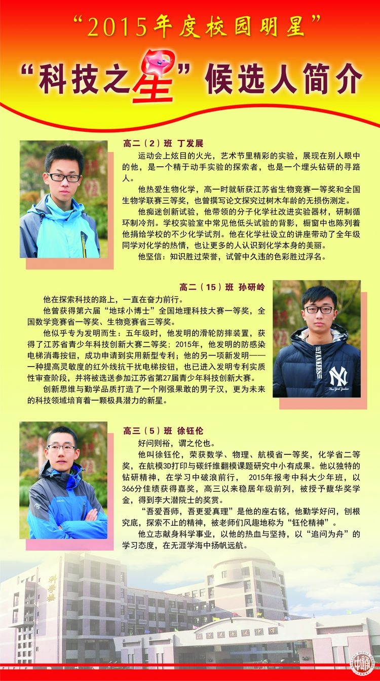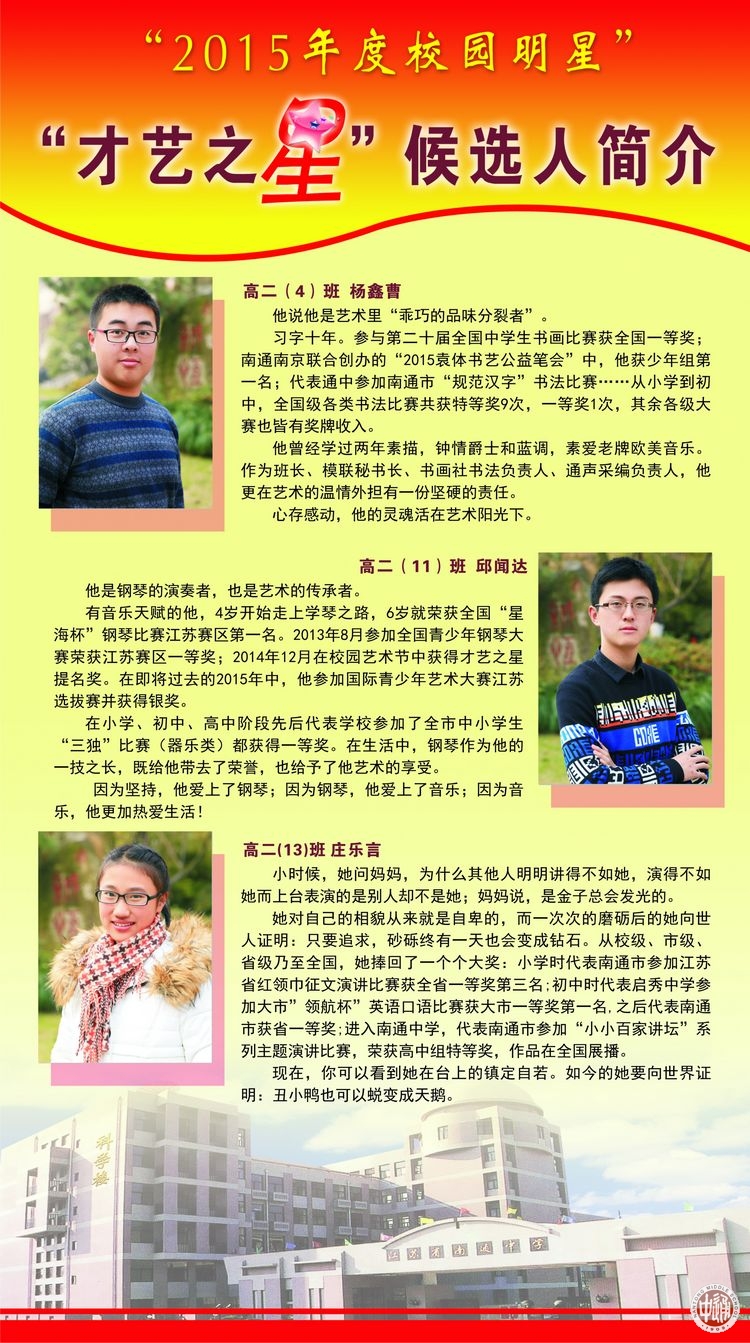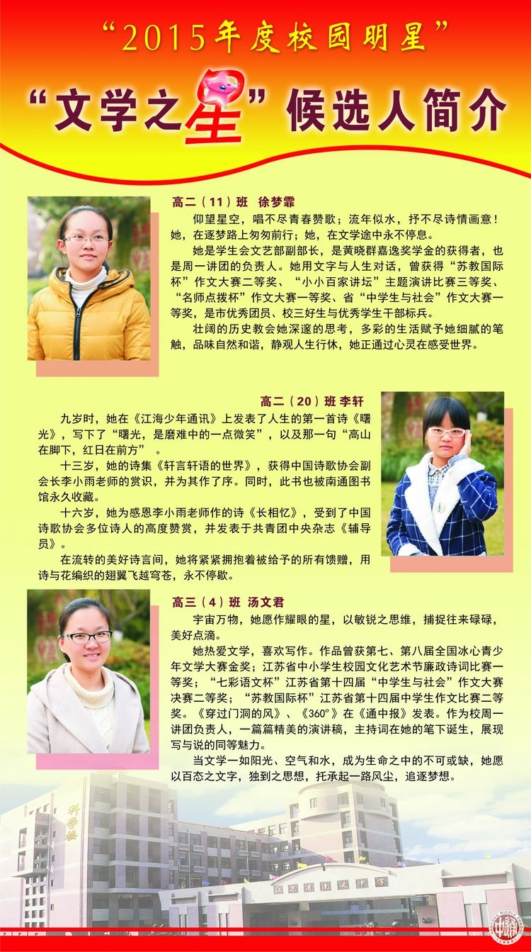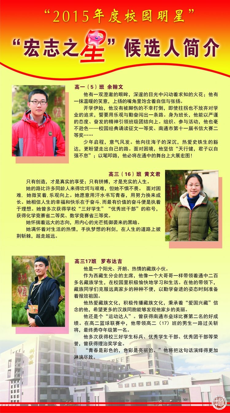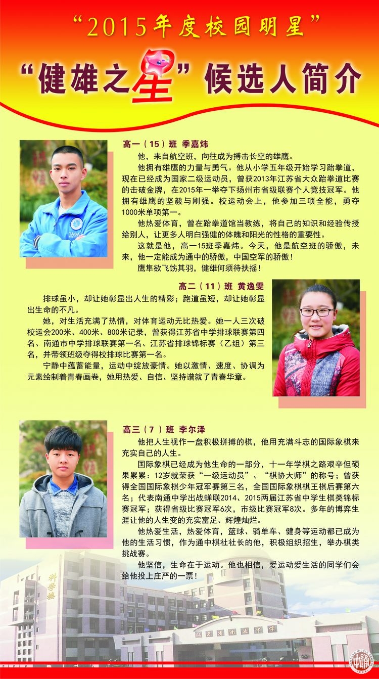 近日,我校2015年“校园明星”评选活动拉开帷幕。三十位校园明星候选人的精彩介绍深深打动着同学们,身边的明星成为大家不懈努力的感召力量。12月28日,全校学生将通过普选投票确定十位明星人选。