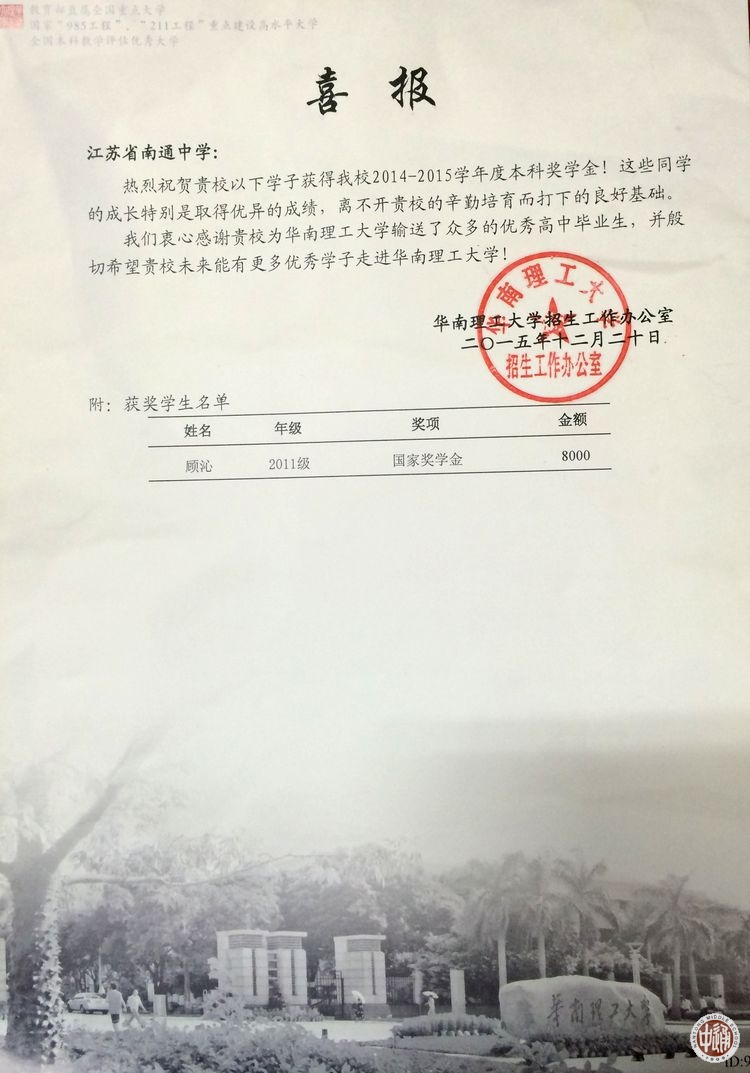 华南理工大学向我校发来喜报 来源:本站原创 发布时间:2016-01-05 10:29:37 浏览次数: 次 【字体:小 大】 近日,华南理工大学向我校发来喜报,对我校优秀校友、该校2011级学生顾沁同学获得国家奖学金表示祝贺,对我校为华南理工大学输送众多优秀高中毕业生表示感谢! 分享到: 【打印正文】