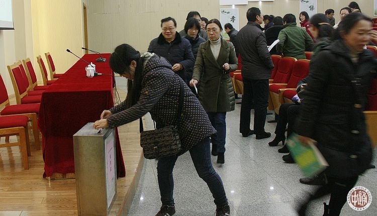 在政治学科朱全中、数学学科杨建楠、语文学科徐晓岚三位老师依次进行了个人述职之后,与会人员认真填写了测评表投入票箱。