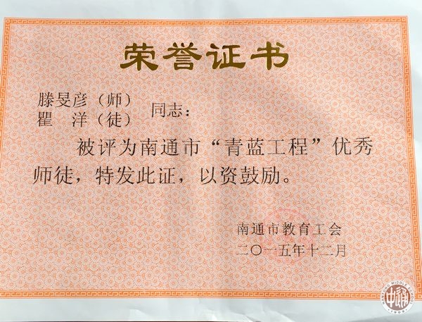 在市教育工会组织开展的2015年度南通市“青蓝工程”优秀师徒评比活动中,我校化学学科滕旻彦、瞿洋两位老师被授予南通市“青蓝工程”优秀师徒称号。