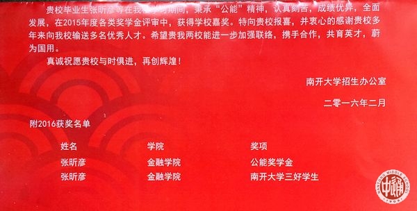 喜报中指出,我校优秀毕业生张昕彦在该校学习期间,秉承“公能”精神,认真刻苦,成绩优异,全面发展,在2015学年各类奖学金评审中,获得嘉奖,荣获“公能奖学金”和“南开大学三好学生”。