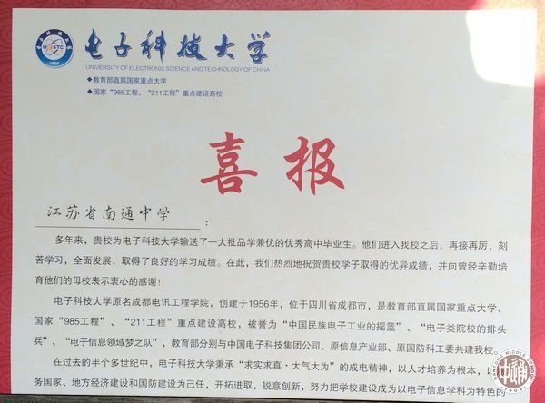 近日,电子科技大学向我校发来喜报,对我校校友在该校求学期间取得的优异成绩表示祝贺,向曾经辛勤培育他们的母校表示衷心感谢。