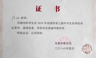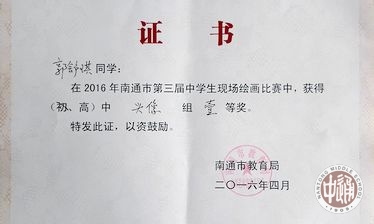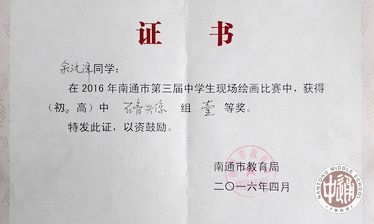 为贯彻落实教育部《关于推进学校艺术教育发展的若干意见》,根据国家教育部基础教育改革和美术课程标准的有关精神和要求,进一步丰富学生的课余文化内容,培养广大学生的创新精神,提升中学生的社会实践能力,展现中学生朝气蓬勃、健康向上的精神面貌,由南通市教育局主办,南通市教育科学研究中心协办的第三届南通市中学生现场绘画比赛于4月24日在中国美院高考培训中心南通基地举行。我校派出参加比赛的4名同学全部获奖。