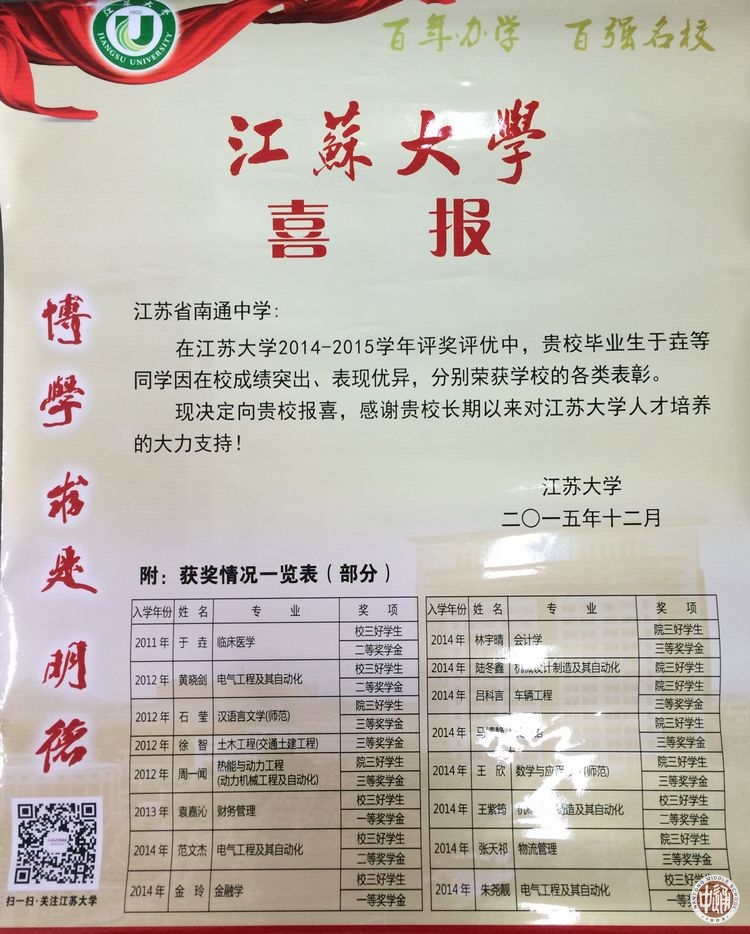 江苏大学向我校发来喜报 来源:本站原创 发布时间:2016-05-12 16:55:51 浏览次数: 次 【字体:小 大】 近日,江苏大学向我校发来喜报,对我校校友在该校求学期间成绩突出、表现优异,荣获该校各类奖励表示祝贺,向学校长期以来对该校的人才培养给予的大力支持表示衷心感谢。 分享到: 【打印正文】
